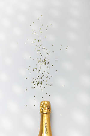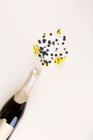 Holiday attributes. Bottle of champagne and confetti in form of splashes for new year on beige background. Top view