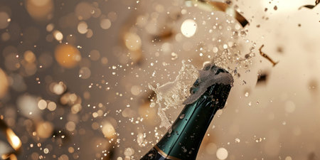 A champagne bottle sprays water droplets amid glowing golden bokeh, radiating festive energy for celebrations like New Year or weddings.