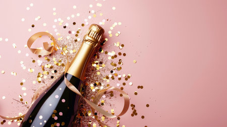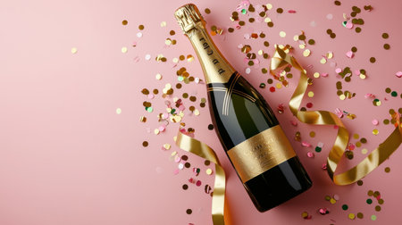 Champagne Bottle and Pink Confetti for Celebrations, Festive Occasion, New Year or Party Concept.