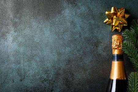 Christmas fir tree and champagne. Top view flat lay with copy space for your greetings