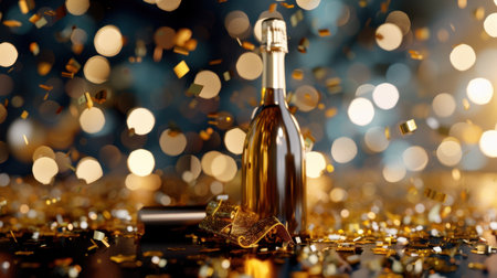 A stunning champagne bottle stands amidst a cascade of golden confetti, illuminated by soft bokeh lights, perfect for capturing the essence of celebration and festivity.