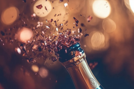 A cork pops from a champagne bottle, sending a shower of sparkling confetti into the air, symbolizing celebration and new beginnings. - Generative AI