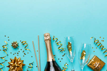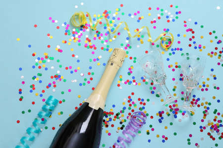 bottle of champagne with glasses and colorful confetti on colored background. top view flay lay.