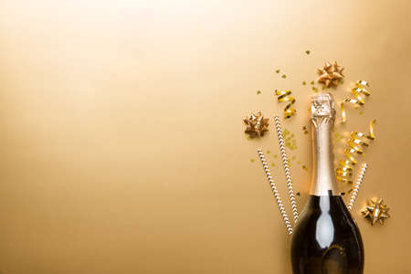 Celebration background with golden champagne bottle, confetti stars and party streamers. Christmas, birthday or wedding concept. Flat lay.