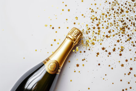 Festive Celebration: Sparkling Champagne Bottle amidst Confetti and Gold Party Decorations on White Background