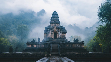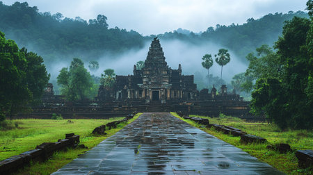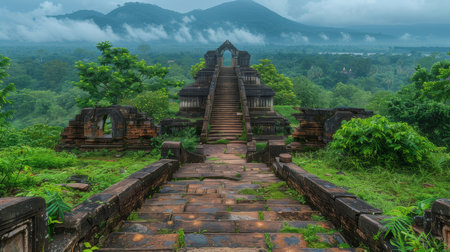 Captivating view of UNESCO World Heritage site Vat Phou, an ancient Khmer temple set against misty mountains and lush greenery in a serene morning atmosphere.