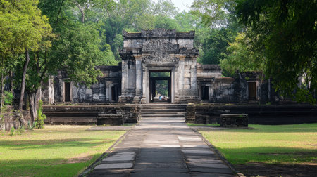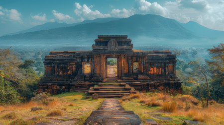 Explore the breathtaking intricacies of this ancient temple entrance featuring detailed carvings and a weathered stone finish, set in a serene natural landscape.