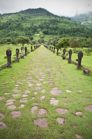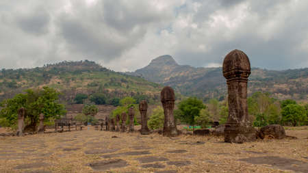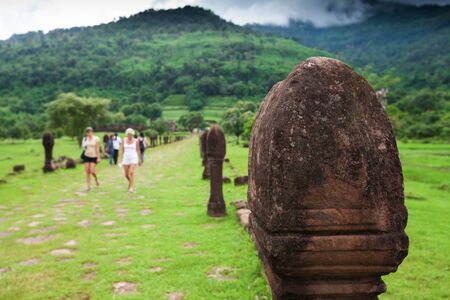 Ancient sculpture sandstone pillars at Vat Phou, South Laos. Tourists, mountains and clouds backgrounds. Public park. Bright sunlight. Shallow dept of field.