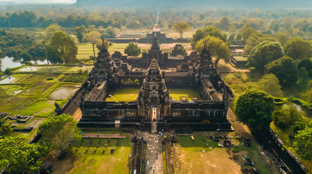 Aerial view of a stunning ancient stone temple set amid vibrant fields and lush greenery, showcasing the beauty of nature and historical architecture.