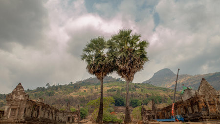 A scenic shot of the Khmer Hindu temple complex Wat Phu (Vat Phou) in Laos