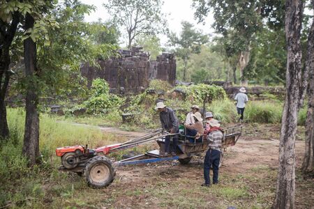 people with a tractor at the Khmer Temple of Prasat Neak Buos east of the Town of Sra Em north of the city Preah Vihear in Northwaest Cambodia. Cambodia, Sra Em, November, 2017,