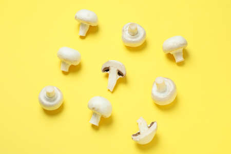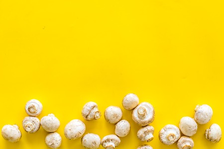 Mushroom champignons. Fresh raw whole champignons on yellow background top view copy space