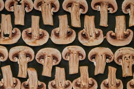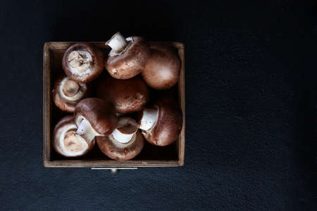 Mushrooms on black stone surface. Top view, copy space. Fresh raw champignon with a brown cap on dark background.