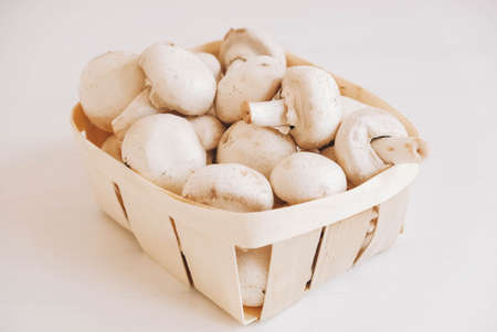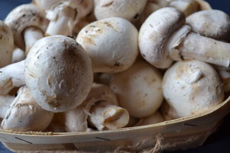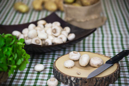 Fresh mushrooms champignons in wooden plate on the kitchen table.