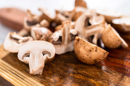 Fresh brown champignon mushrooms. Close up woman's hands cutting a fresh mushrooms, copy space