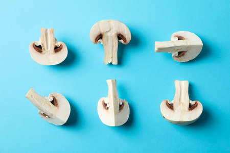 Brown Paris or portobello mushrooms painted blue table,top view.