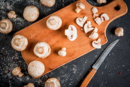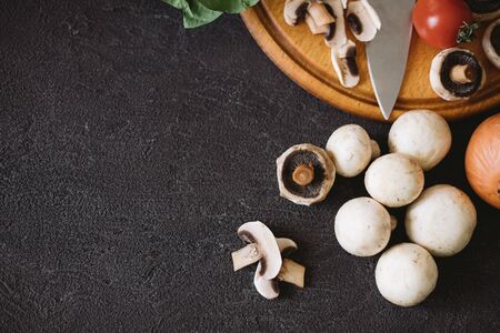 Fresh raw mushroom champignon on a cutting dske, with a knife. On a dark gray stone table. Top view