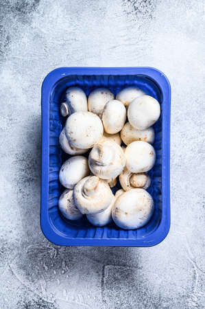 Fresh champignons in plastic packaging. Gray background. Top view.