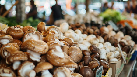 A vibrant assortment of fresh champignons fills a supermarket counter, showcasing their smooth caps alongside other mushroom varieties, inviting shoppers to select. Generative AI.