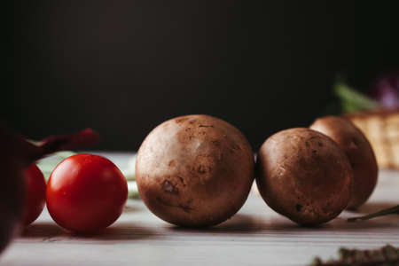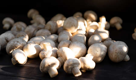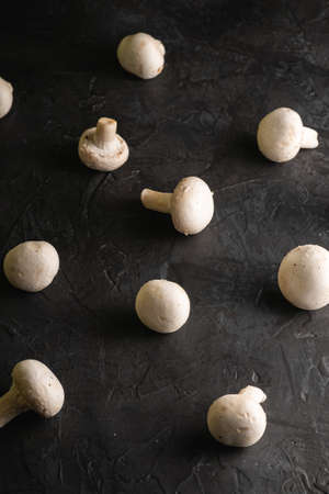 Champignon mushrooms healthy food on dark black textured background, angle view