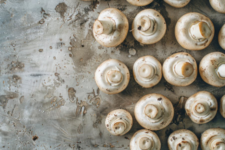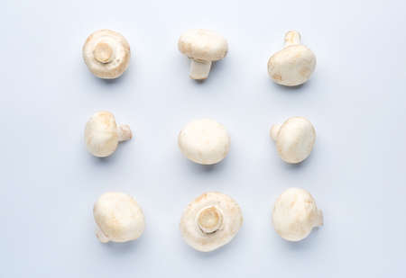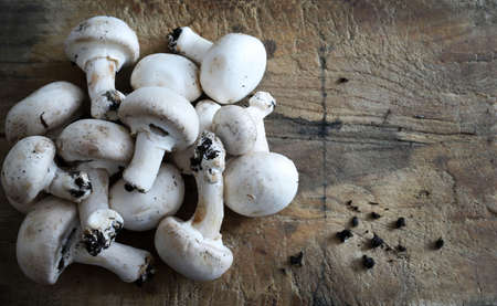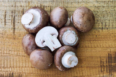 Group of champignon mushroom on rustic background. Healthy food. Directly above.