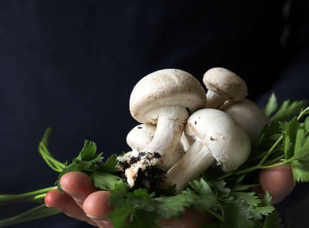 Man's hands holding champignon mushroom and parsley on black background. Vegetarian healthy food. Close-up.