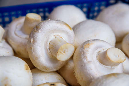Close-up of exotic mushrooms in blue plastic boxes, champignons grown gourmet. Part of the series. Close up