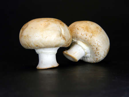 Champignon mushroom on black stone background. Vegan food concept. Side view, copy space.
