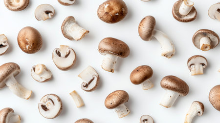 An overhead view of mushrooms scattered on a white background, with some whole and others sliced, creating a visually appealing arrangement.