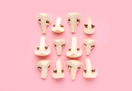 Shiitake and portobello mushrooms lie, isolated on a soft blue and Pink Pastel