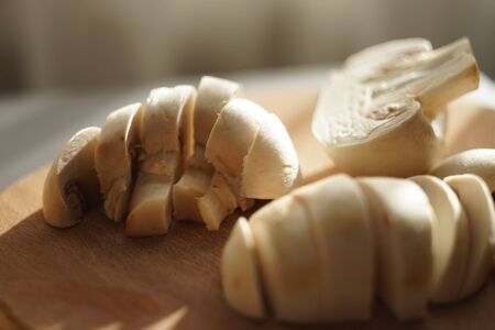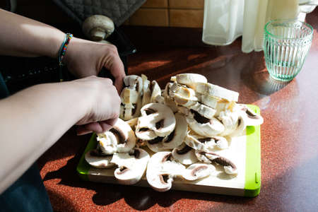 Close-up of hands with a sliced fresh mushrooms on a cutting board. Homemade cuisine vegetarian. Sunlight from window, shadows on the table.
