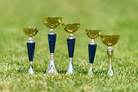 Track and Field trophies, outdoor on a bright sunny day with selective focus on the nearest trophy, blurred blue sky background