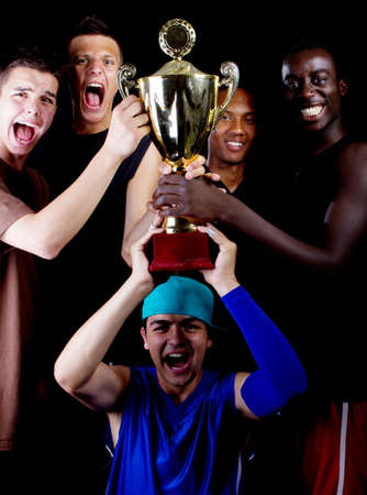 Young fresh group of teenagers with a trophy. They are celebrating.