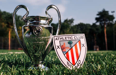 August 30, 2021 Bilbao, Spain. The emblem of the Athletic Bilbao football club and the UEFA Champions League Cup on a green lawn.