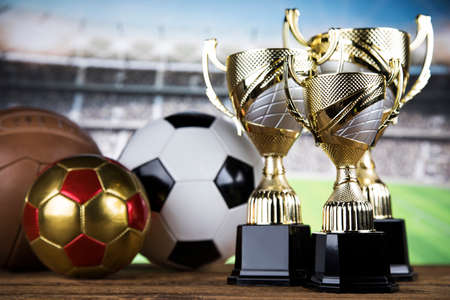 collection of trophies, cups, awards and medals on the table, success and sport competition concept