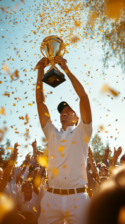 jubilant golfer holding a trophy aloft, with confetti falling and a crowd cheering in the background, symbolizing ultimate success in the sport