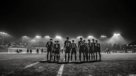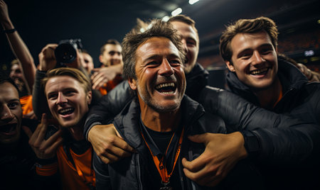Competitive sport success Men soccer team cheering under spotlight outdoors generated by artificial intelligence