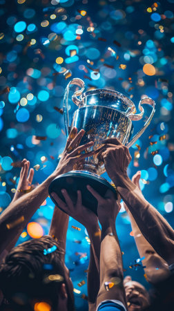 A gleaming gold trophy being held high in the air by a victorious team, with confetti falling all around.