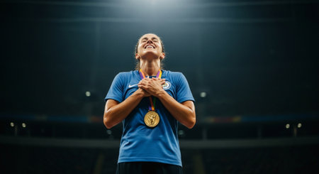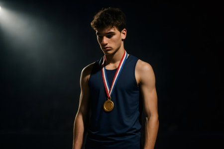 Determined athlete stands under a spotlight, wearing a gold medal, symbolizing achievement and dedication in competitive sports