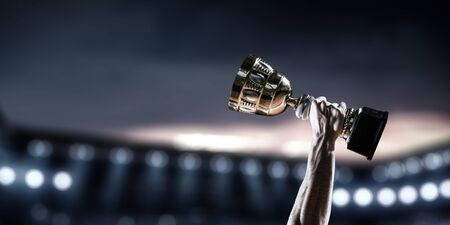 Close-up Of Hand Holding Championship Trophy In Crowded Stadium After Football Victory