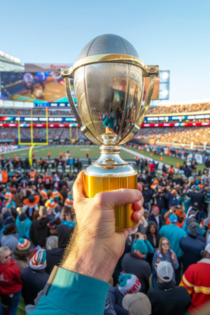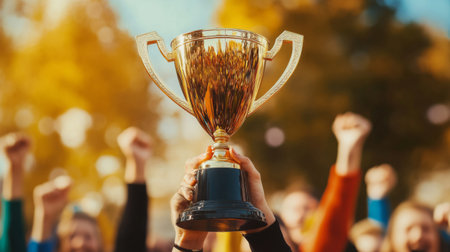A vibrant image capturing the moment of celebration as a trophy is lifted high amidst a cheering crowd, symbolizing victory and achievement in an outdoor setting.
