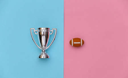 Mini rugby ball and champion cup on a blue pink pastel background. Minimalism Sport concept. top view. flat lay
