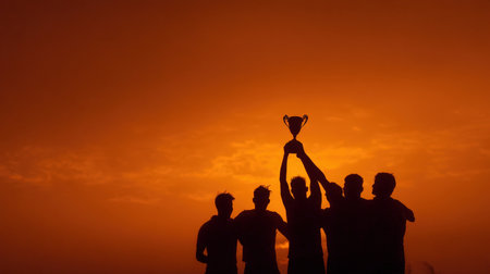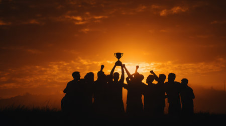 A diverse group of teammates holds a championship cup aloft, silhouetted against a glowing orange sky. The image captures emotional unity and success in a side profile composition.