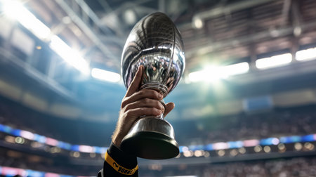 Close-up Of Hand Holding Championship Trophy In Crowded Stadium After Football Victory