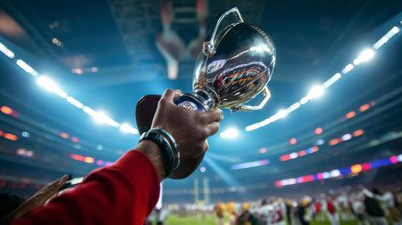 the essence of triumph and competition in a stadium with a glaming grand trophy as the focal point