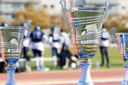 close-up, beautiful gold and silver cups, awards for outdoor cycling competition. High quality photo