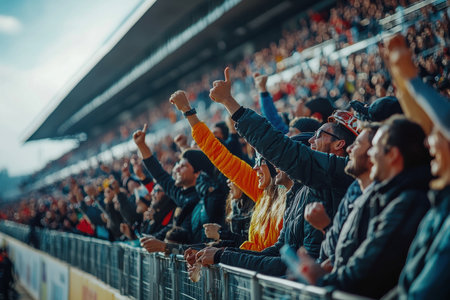 Amidst the electrifying atmosphere of the stadium, a sea of enthusiastic sports fans rises to their feet, their cheers echoing throughout the arena as they rally behind their beloved team, encouraging them towards victory with unwavering support.