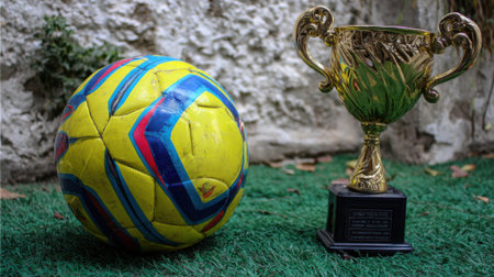 A vibrant soccer ball rests beside a golden trophy on artificial turf, with a textured stone wall behind.