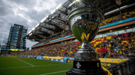 Golden trophy standing in a stadium, representing victory, achievement, and the culmination of hard work and dedication in a sporting event