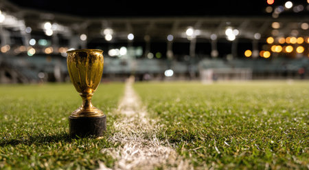 A golden trophy sits prominently on a lush green field, marked with white lines. The image captures a low-angle perspective, showcasing the trophy against a backdrop of blurred stadium lights. The scene evokes a sense of victory and achievement, suitable for various commercial and editorial applications.